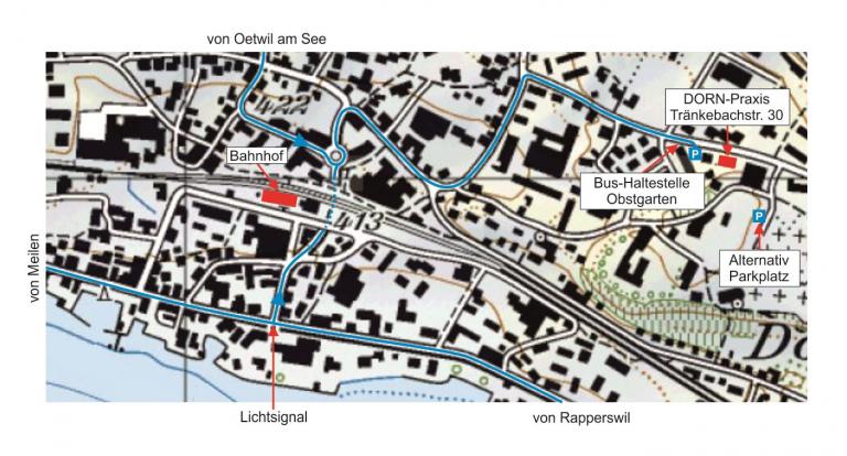Ab Bahnhof Stäfa mit dem Bus Nr. 955 bis Haltestelle "Obstgarten"