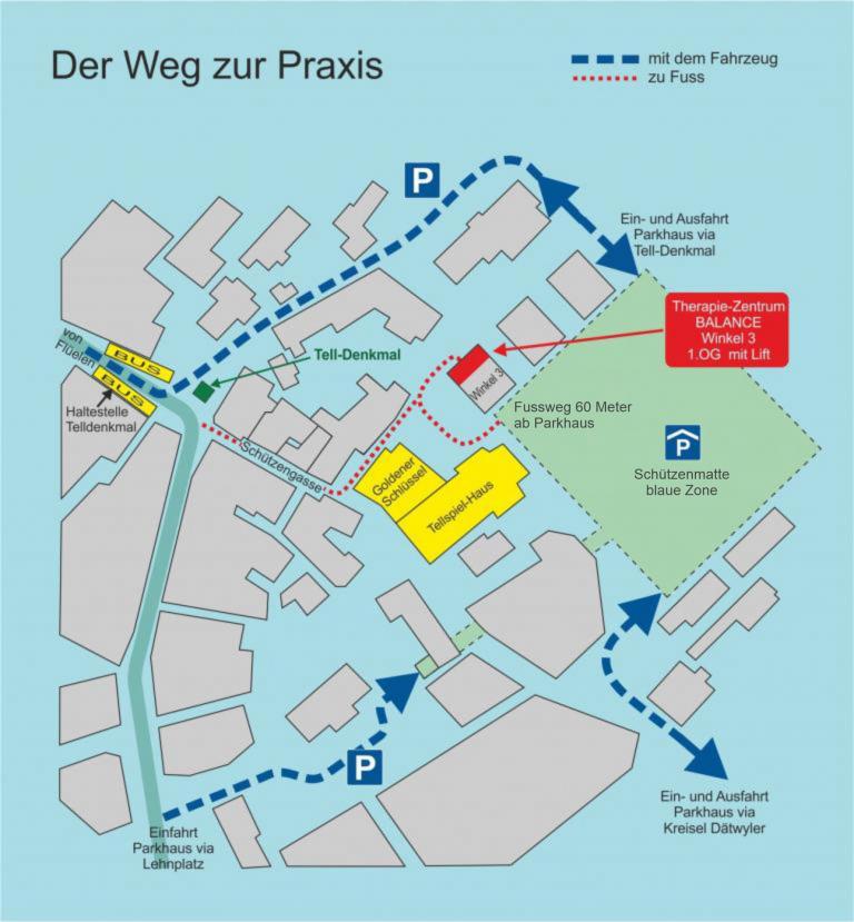 Mit dem Bus zur Haltestelle "Telldenkmal", von dort ca. 150 Metern zu Fuss bis zum Therapie-Zentrum BALANCE